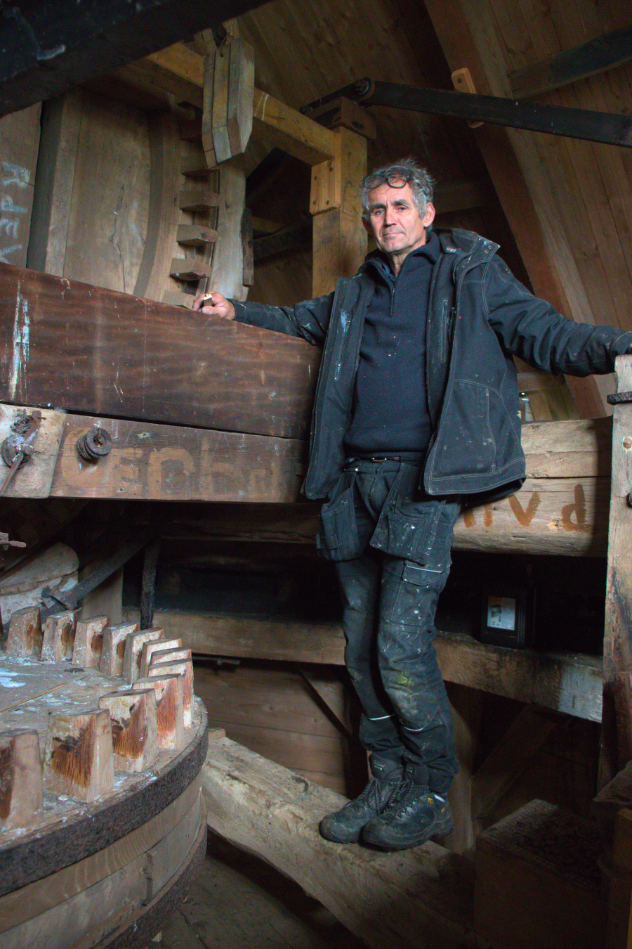 “Er zijn bijna geen molens in Nederland met drie schroefbakken. Dat maakt het uniek. Je kunt hier niet vanaf een standaard tekening werken. Alles meten we ter plekke in. Het is eigenlijk een grof horloge: als één kam niet mooi op steek staat, draait de molen niet goed. Het komt op de honderdste millimeter nauwkeurig.”